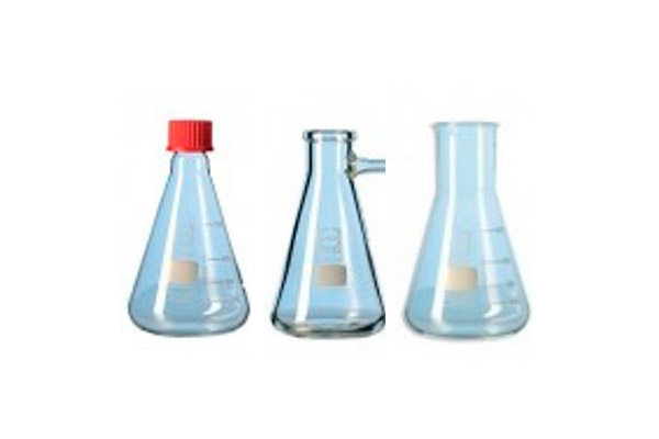 Erlenmeyer de diferentes capacidades. Cuello ancho o angosto, con tapa rosca en caso de requerirse. Erlenmeyer de vacío, para aplicaciones en aspiración de líquidos y filtración por vacío.